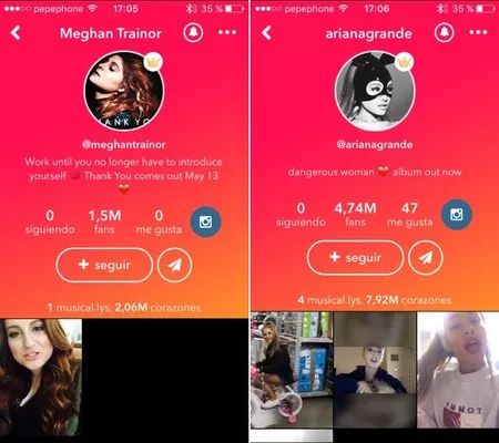 图片来自:Xataka Musical.ly 主打短视频社交,用户可以拍摄一段 15 秒到 1 分钟长度的视频并选择对应的配乐和不同的滤镜及特效。 令人意外的是,Musical.ly 在国内市场反响平平,反倒是在北美市场一炮而红,甚至在 2015 年 7 月打败了 Facebook 和 Youtube 等巨头,登顶美区 App Store 总榜。 目前 Musical.ly 日活跃用户超过 2000 万,其中有 600 多万来自北美地区,包括 Lady Gaga、水果姐、火星哥等明星都是其忠实用户。