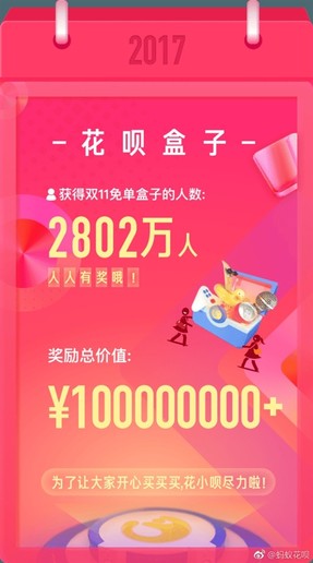 如今双11已经过去,昨天中午,蚂蚁花呗官方公布了最终的中奖情况,广大花呗用户也是翘首以盼。数据显示,获得花呗盒子(双11免单盒子)的人数达到2802万人,而获得双11全天免单的人数为2222人,他们的双11花呗平均消费金额为2405.6元。不仅如此,500元以下免单的有1万人,100元以下免单的有10万人,8-88元随机免单的有100万人。不说了,我得去看看我中没中奖。