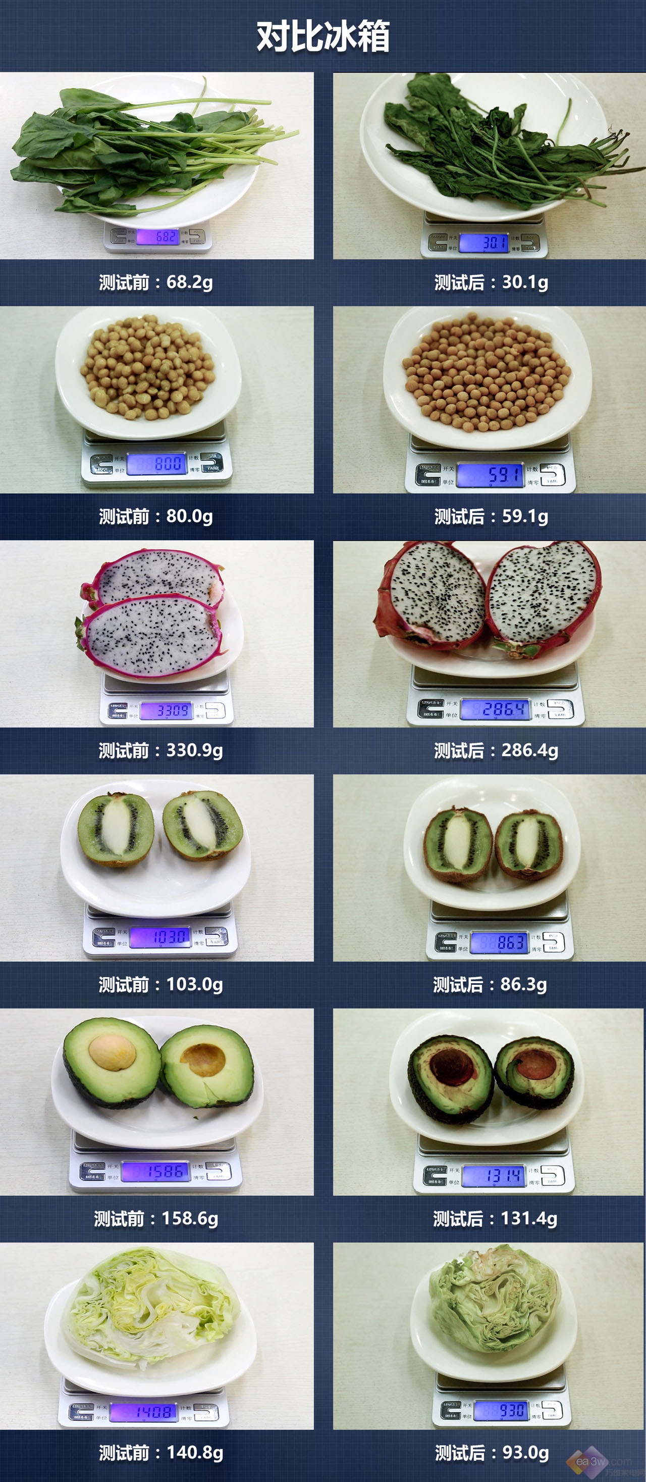 而对比冰箱中的猕猴桃和火龙果早以失去鲜艳的颜色,牛油果也已变黑,圆生菜和菠菜的叶子已经变焉,黄豆也已经干涩,水分严重不足。所有食材,重量变化略大。