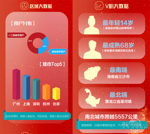 同时最年轻的用户仅14岁,最成熟为68岁,最南端的用户去到了海南省三沙市,最北端去到了黑龙江省漠河镇。这些数据表明,对好产品好手机的追求,部分年龄部分区域。也从侧面反映了vivo品牌以及产品涉及到的用户群越来越广泛,特别实在年轻消费群体中,对vivo手机更加偏爱。