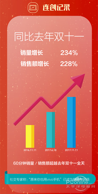 就电商节日来看,从2016年的11.11,到今年的6.18,再到刚结束的11.11,可谓是呈现出直线般的增长。同比2016年的双十一,vivo今年销量增长达到234%,销售额增长达到228%,都是翻倍增长,无疑让vivo的产品和品牌影响力再上一层楼。