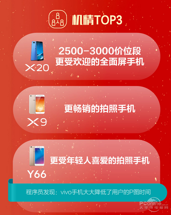 vivo此次双十一能收获满满,以下这三款机子可谓有很大功劳。其中2500-3000价位段更受欢迎的X20全面屏手机就不用多提,而更畅销的拍照手机X9以及更受年轻人喜爱的拍照手机Y66也是拿下了不错的成绩。