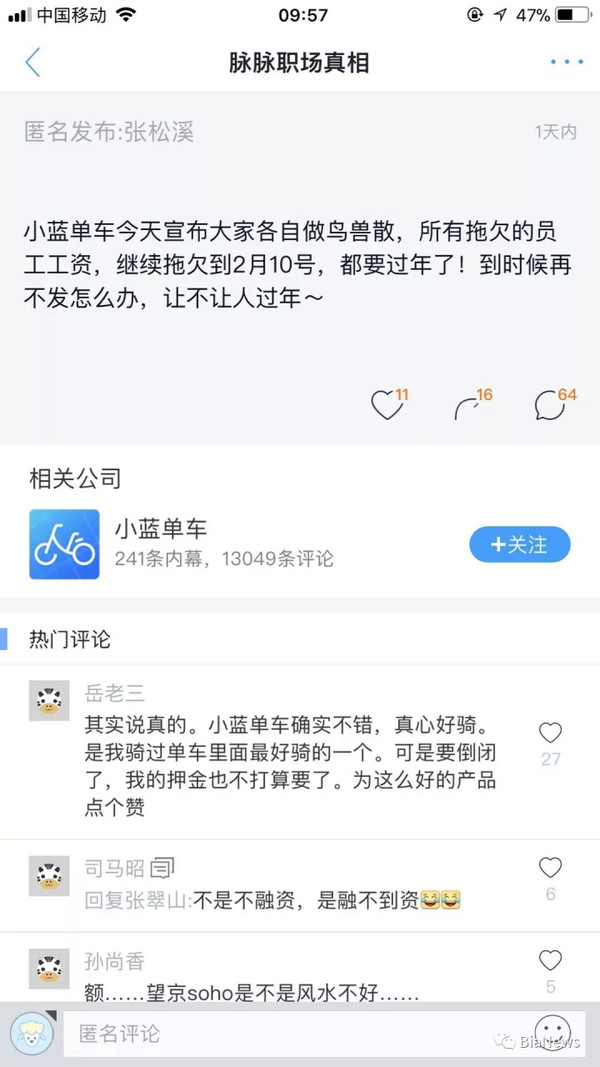 【PConline 资讯】昨天有消息称小蓝车的押金返还的问题并没有在官方设置的限期前解决,今日又有小蓝单车员工在某职场社交平台发布消息称,小蓝单车宣布解散,拖欠员工工资继续拖欠至 2018 年 2 月 10 日。