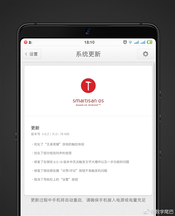 今天 锤子科技向坚果Pro 2用户推送了更新,版本号为4.0.2,其中一项重要内容是优化了《王者荣耀》游戏的触控体验,玩家终于可以愉快地打农药了。