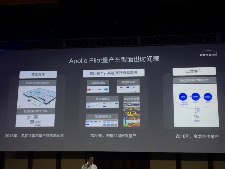 截至2017百度大会上交成绩单当天,Apollo平台正式开放两款落地产品,分别为Apollo小度车载智能系统和Apollo Pilot自动驾驶产品。商业量产上,百度将与金龙客车在2018年推出中国首款无人驾驶微循环巴士“阿波龙”,与江淮、北汽在2019年,与奇瑞在2020年推出自动驾驶量产车型。除此之外,百度还透露将与雄安新区就智能出行展开合作。