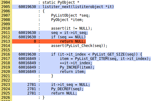 在 CPython2 上,要显示代码热图(下面的第一行调用)和代码分析(下面的第二行调用):
