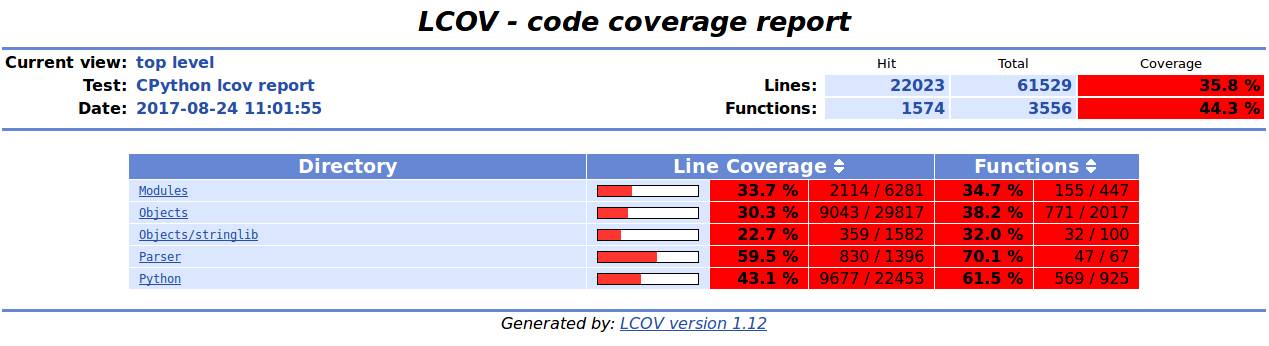 第一行代码将会使用 GCOV 支持(https://gcc.gnu.org/onlinedocs/gcc/Gcov.html)编译该解释器,第二行将运行负载并收集在 .gcda 文件中的分析数据,第三行代码将解析包含这些分析数据的文件并在名为 lcov-report 的文件夹中创建一些 HTML 文件。