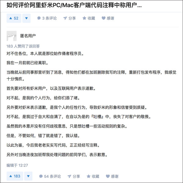 据报道,虾米音乐App前员工八座在知乎更新评论,“今后我老老实实写代码,正正经经写注释”。他说,在自以为是的“吐槽”中丧失了对客户的敬畏,对所有虾米用户,以及互联网用户表示道歉。