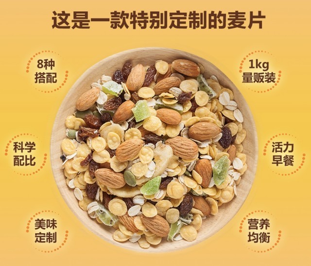 福事多水果谷粒早餐麦片是麦片与粗粮等原料混合烘培后制成的,果仁搭配,营养加倍。这是一款大人、孩子、老人、青年吃了都称赞的营养麦片。谷物粗粮,非油炸,富含膳食纤维+蛋白质,拿来冲泡酸奶或者牛奶,味道棒极了!