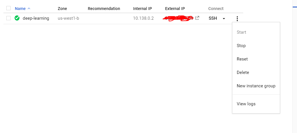 注意:不要忘记停用你的 GPU 实例:点击上图三个点图标(右),选择「STOP」。不然,谷歌云平台将按小时计费。