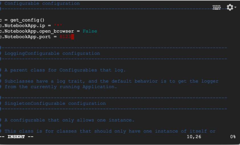 我们要在你的 Jupyter 配置文件中添加几行;配置文件是纯文本,所以你可以用自己喜欢的编辑器(如,vim、emacs)添加。确保用第 5 步设置的端口号替换该端口号。