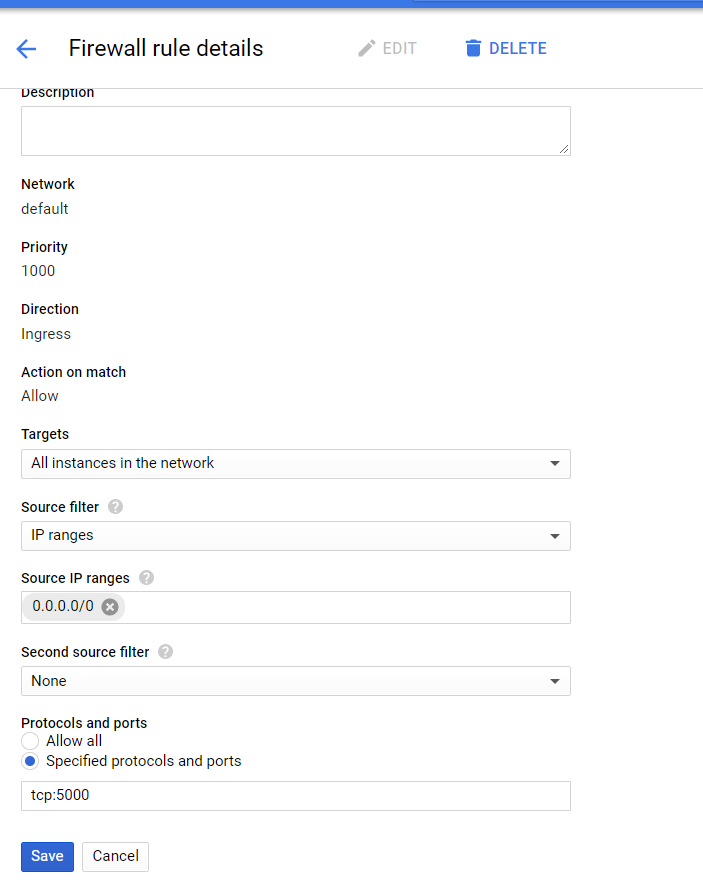 在「protocols and ports」下,你可以选择任意端口。我选择 tcp:5000 作为我的端口号。现在点击「save」按钮。