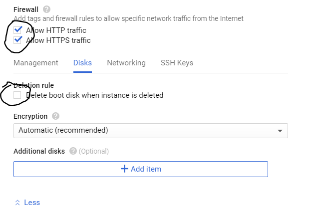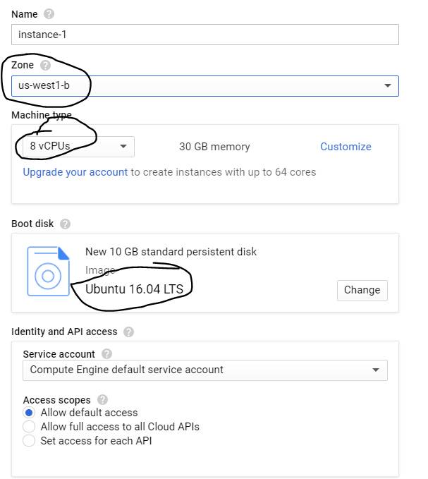 现在点击「Create new instance」。添加实例名称,选择域为「us-west1-b」。选择「machine type」(我选择的是 8 vCPUs)。选择启动磁盘为「Ubuntu 16.04 LTS」。在防火墙(firewall)选项中,选中「http」和「https」(非常重要)。然后,选择「Disk」,取消「Delete boot disk when instance is deleted」。