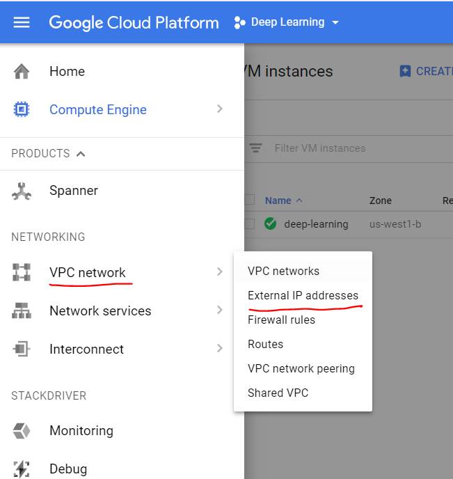 默认情况下,外部 IP 地址是动态的,我们需要将其设置成静态。点击左上三条线,然后在「networking」选项中,选择「VPC network - External IP addresses」。