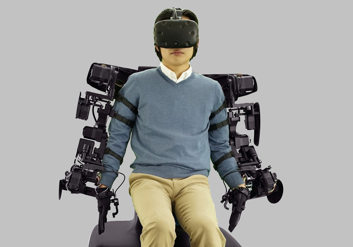 VR 头显用来显示机器人的视觉,脚的活动则通过人踩着的模块来捕捉。穿在身上那个类似外骨骼的东西能够捕捉人从肩膀到手掌的运动,操控者只要做出动作,T-HR3 就会跟着动。