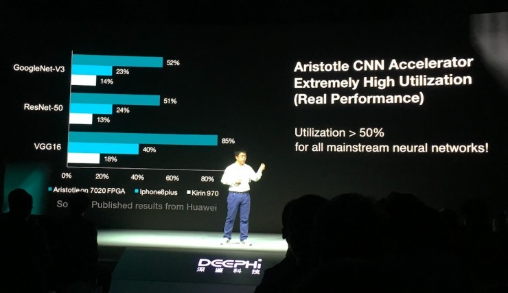 2017 年 10 月 24 日,专注于提供深度学习软硬件一体解决方案的中国创业公司——深鉴科技,宣布完成 A+ 轮 4000 万美元融资;而这轮融资的领投方,就包括三星。深鉴科技目前已经推出了数款深度学习处理器(DPU)产品,其中有一款是基于 FPGA 的 Aristotle 加速器,这款产品被深鉴科技用于与苹果 A11 和华为麒麟 970 进行对比,可见这类产品用于智能手机的潜在可能性。