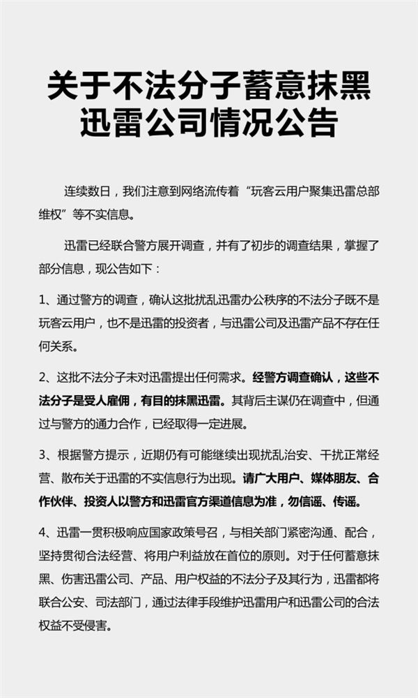 原标题:迅雷:“玩客云用户聚集迅雷总部维权”是恶意抹黑 近日,网上传闻称有玩客云用户聚集迅雷总部进行