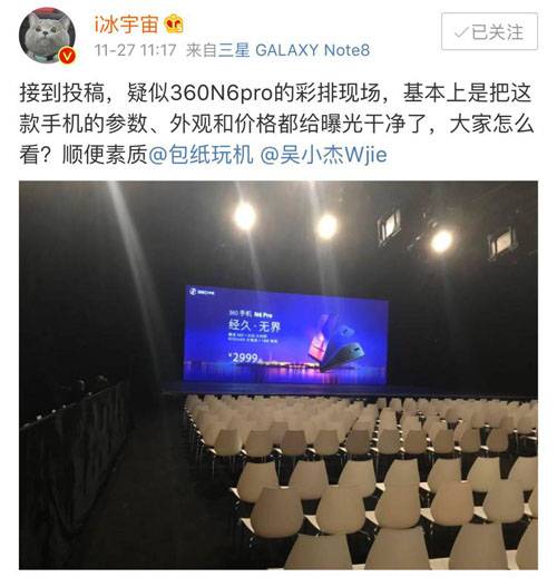 @ITbear 【360手机N6 Pro发布会keynote泄露,2999元坐实了?】360手机将于明日在北京召开新品发布会,届时年度旗舰N6 Pro将会亮相,网友对其全面屏外观设计抱有极高的期待。而今天,知名数码博主“i冰宇宙”爆出了360手机发布会现场keynote照片,关于360手机N6 Pro真机外观和配置信息,几乎完全地泄露了。
