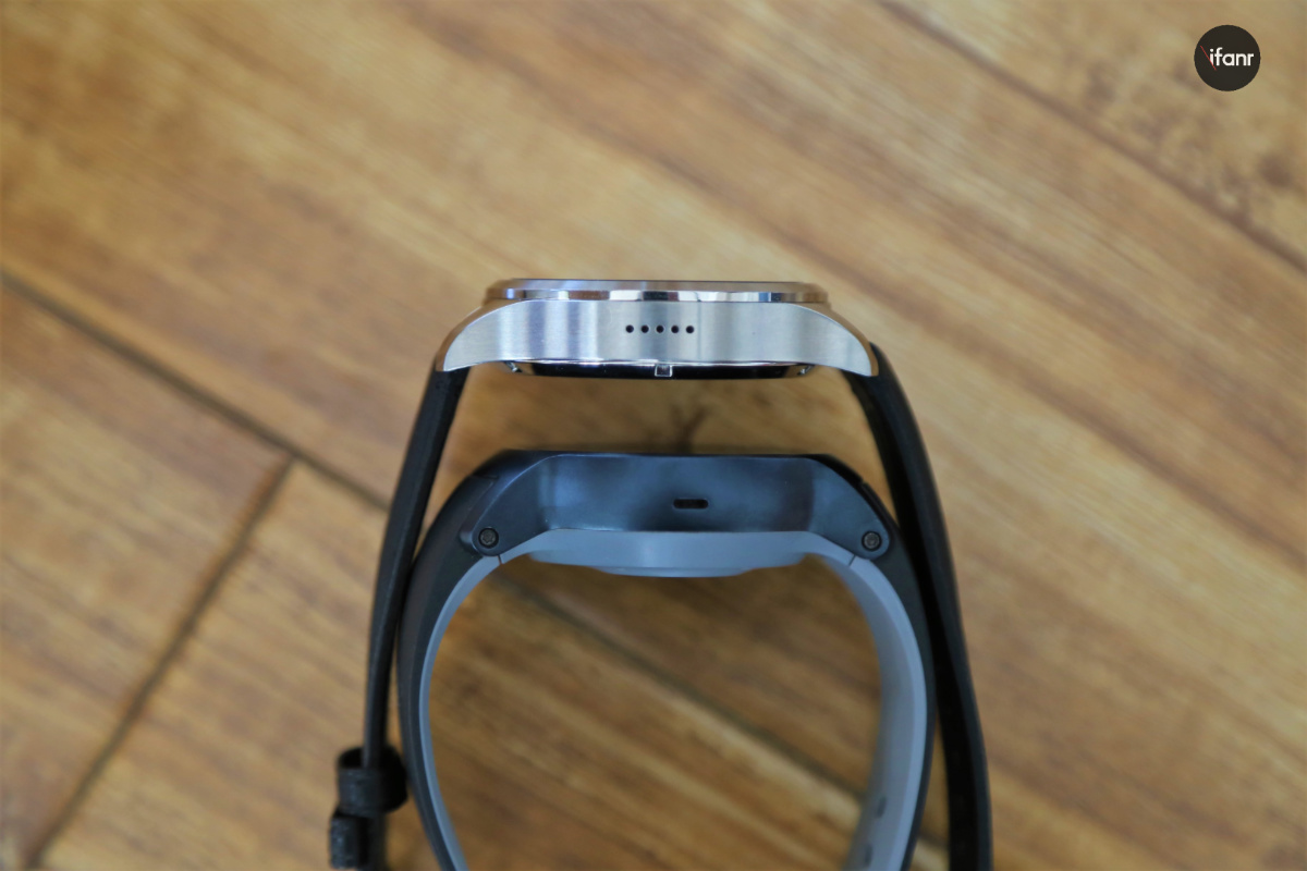 46mm 的表壳也意味着它的个头不算小,不过由于没有放置 sim 卡的位置,表身的厚度控制的倒是比较得当。不过,心率传感器似乎也被一同摘除了,在系统中也没有找到相关的设置。