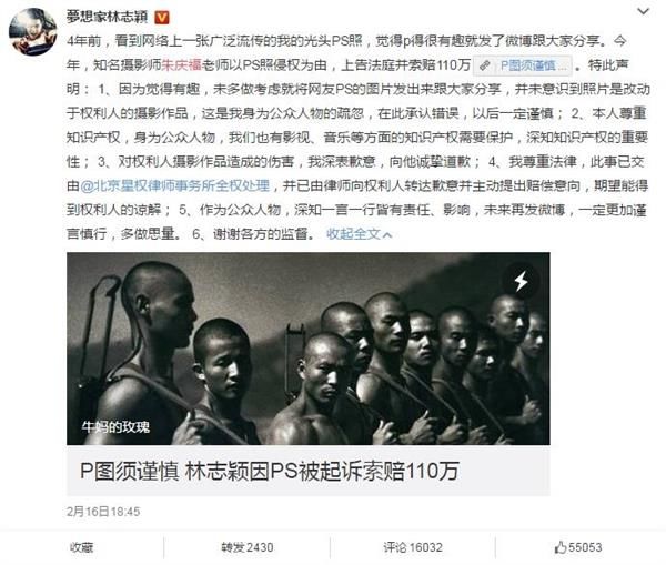 对此,林志颖之前也在个人微博进行道歉:“因为觉得有趣,未多做考虑就将网友PS的图片发出来跟大家分享,并未意识到照片是改动于权利人的摄影作品,这是我身为公众人物的疏忽,在此承认错误,以后一定谨慎。”