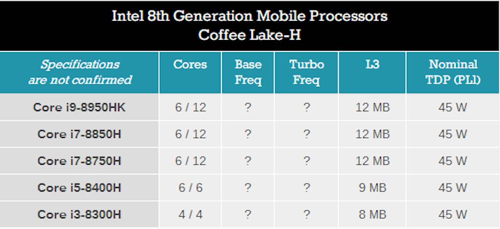 认准型号,Coffee Lake 移动版将至 由于之前所讲,8 代酷睿很可能在明年 1 月就进入三代架构同堂的局面,对于消费者来说,一定要尽可能选购更新架构的产品。 在 Kaby Lake-Refresh 架构的笔记本处理器卖了将近 4 个月之后,最近 Coffee Lake 架构的笔记本处理器家族也要到来了。