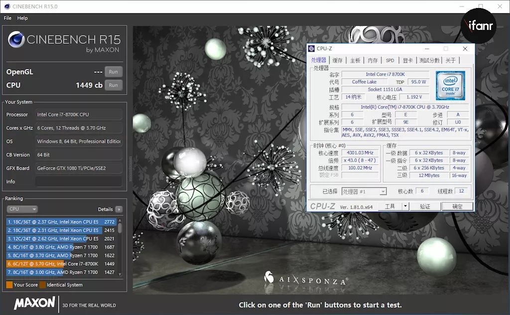 在大家熟悉的 GeekBench 环节中,i7-8700K 跑出了单核 5600,多核 24000 的分数,这个多核成绩相比我们今年测试的 2017 款中配 iMac 27 寸的多核心成绩翻了近一倍,即便与泄露出的 8 核心至强处理器的 iMac Pro 相比也不遑多让。 在更贴近日常使用需求的 CineBench 测试中,i7-8700K 的 CPU 分数达到了 1449cb,在 CineBench 的排名当中,位于这个测试成绩之上的都是 12 核甚至 16 核的处理器。