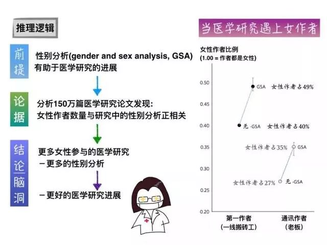 当然,尼尔森和同事们做这个研究不是为了看论文识性别,而是想通过了解医学研究人员中的性别差异,提高科学家在医学研究中对生理性别差异和社会性别差异的认识,进而推动医学研究的进展。更多女性参与设计及撰写的医学研究论文会纳入更多的性别分析,从而更好地认识疾病风险,研究疾病的预防及诊治策略。