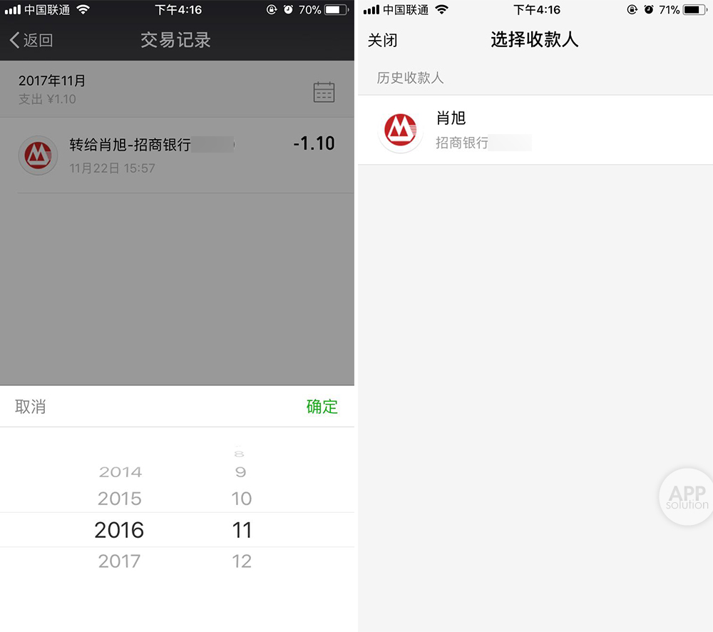 转账成功后,左为转账人,右为收款人