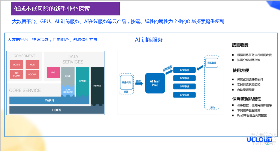 像银行、互联网金融等客户,大家都在进行大数据和AI的服务,但是大家又不愿意自己去采购昂贵的GPU机型,不愿意把自己的AI算法高手分心去搭建一些底层的框架等,而这里正是因为云计算的AI、大数据等平台产品,给大家提供了一个低成本、高效、灵活的试错环境。