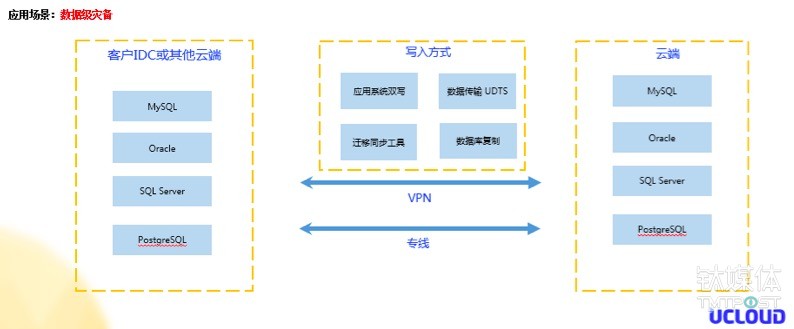 比如把客户IDC以及其他云端的一些数据库,通过专线VPN的方式打通之后,基于应用双写或数据传输,就可以很便捷的在云端实现一个数据级灾备,做到一个同城或者跨地域的数据级灾备。