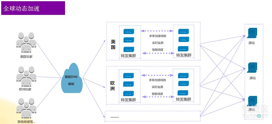 比如某个游戏客户是针对全球服务的,他的源站主要部署在大陆,然后通过全球动态加速的产品,快速地实现一些链路的优化,同时实现全球不同地域用户的就近访问。像美国的玩家可以通过自动的DNS解析到美国链路的入口,通过内网快速的访问国内的源站,欧洲类似于其他亚太等等地域都是类似的。