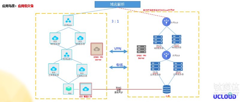 基于云端其实还可以实现一个应用级灾备,也可以做到应用双活。这张图是一个跨云双活的方案。左边部署在某个云端上面,右端是部署在UCloud上,生产和灾备是以3:1的方式来进行部署,中间通过VPN或者专线进行打通,然后从底层数据库级别实现一个主从的复制,应用级别后通过一些内网的调用,最后到上面的域名解析阶段。一旦发生容灾时,我们就可以把域名的IP快速解析到灾备的外网IP上面。