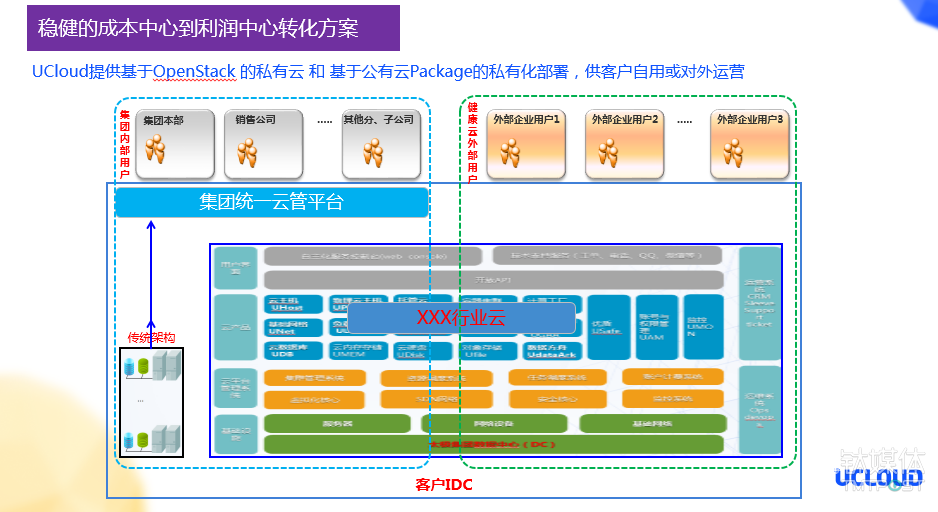 在这张图片中显示大概就分为三部分,左边就是传统的硬件、架构,通过统一云管平台来进行管理,同时接入Openstack私有云,再纳管行业云(健康云),实现统一的管理和部署。实现了集团内部用户的运营服务,对外提供行业云的运营。