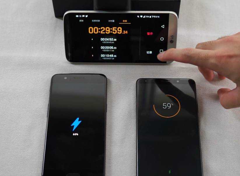 一加 5 的充电速度和华为 Mate 10 差不多,基本上是齐头并进。在十分钟过后,一加 5 已经充电至 20%,而华为 Mate 10 也充电至 20%,充电速度方面不相上下。