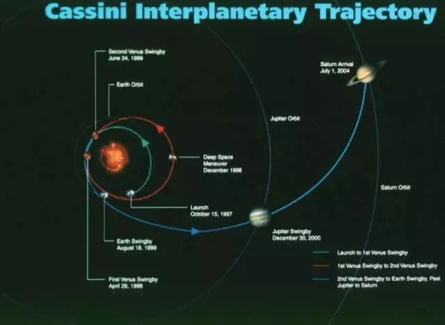 在旅行者号发射升空的20年后,同样借助引力弹弓效应,卡西尼号也开始了它的旅行。首先,它飞向方向相反的金星,并于1998年4月和1999年6月两次向金星借力;然后,它于1999年8月飞回到地球附近,向地球也借了一次力;接着,它于2000年12月飞到木星附近,向木星又借了一次力;最后,它于2004年7月飞到土星,成了土星的第一颗人造卫星。尽管整个路程是正常路程的2.5倍,由于引力弹弓大大提升了探测器的飞行速度,最终的飞行时间反而大大减少。