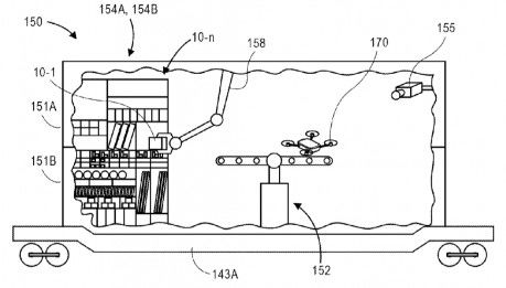 2017年8月份,亚马逊又申请了一项新专利,是关于在运输船、货车等移动物体上启用无人机的技术。可视为一个“无人机移动飞行平台”。亚马逊要在大型移动运输设备上搭建高度自动化的集装箱,里面设置可旋转停机坪用于无人机起飞,控制机械臂为无人机装载电池和货物装载完成后,货柜顶部随之打开,无人机起飞。整个过程也是全自动化并有摄像机进行监控。