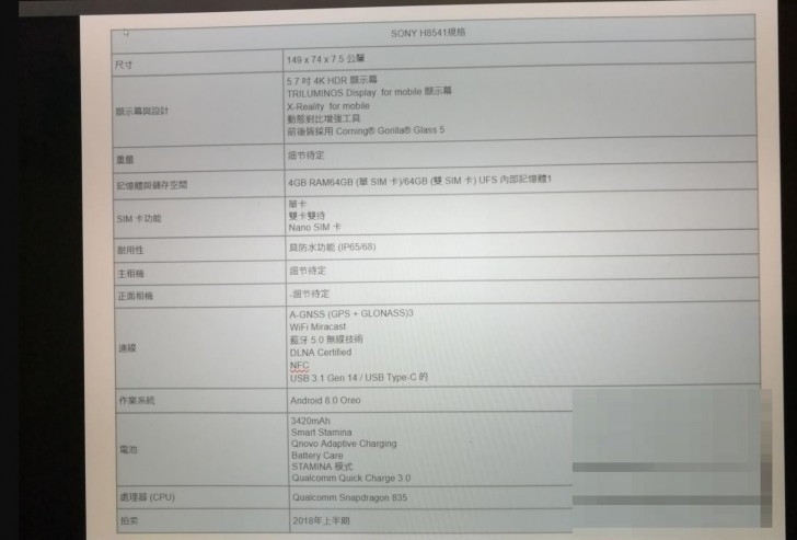 索尼 H8541 的详细参数如下,这款手机有这 5.7 英寸、4K 级别分辨率的显示屏,4GB 运行内存,64GB 存储空间,有单卡和双卡两个版本。同时还有 3420 毫安时电池,高通骁龙 835 处理器。