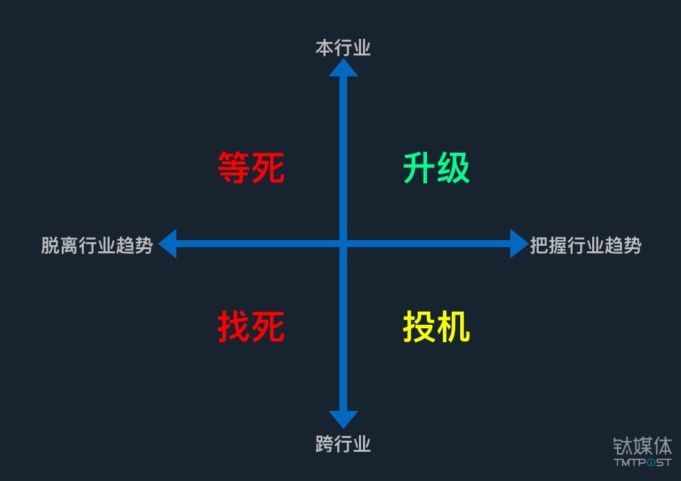企业转型的原则可以用一个四象限来表示。其中一个维度就是你是在本行业还是跨行业,另外一个维度就是你有没有去把握行业趋势,这样就可以出现四种情况: