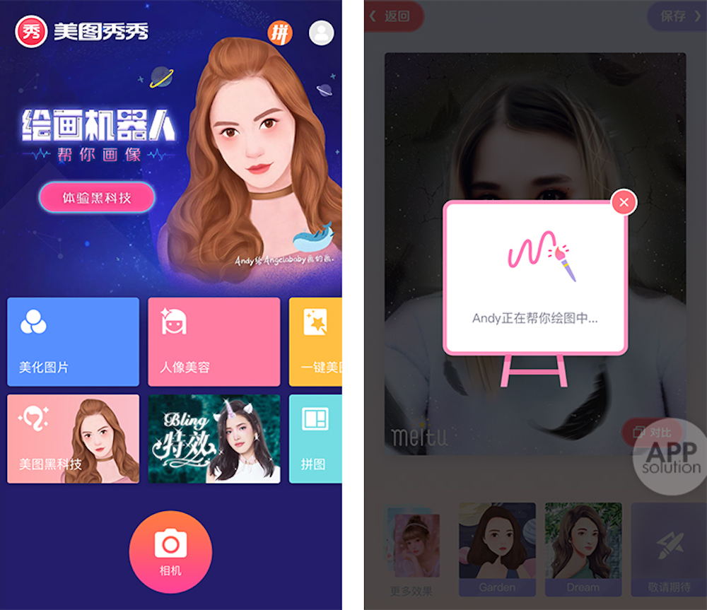 AI 引领拍照新风尚美图机器人 Andy 上线仅 4 天,就有 1900 万人体验过。Angelababy、唐嫣等明星在第一时间也亲身体验了这款实用的拍照 App,她们的插画风照片在微博上累积获得了 40 多万的转发点赞量。