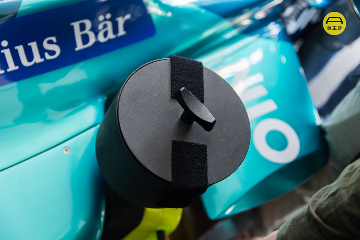 由于电池组会在比赛中散发可怕的热量,所以每台 Formula E 赛车都要用干冰来冷却,这就是蔚来赛车冷却用干冰的注入口。