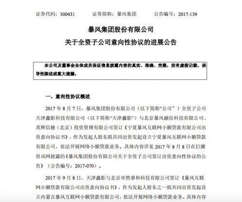 9月8日,天津鑫影与北京卓然睿和科技有限公司签订《暴风互联网小额贷款有限公司出资意向协议书》,暴风作为发起人股东之一拟共同出资发起设立内蒙古暴风互联网小额贷款有限公司,依法开展网络小额贷款业务。
