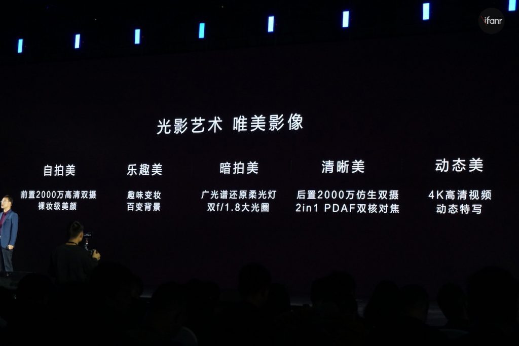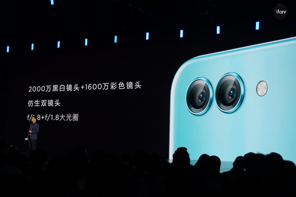 后置摄像头部分采用 2000 万像素(黑白)+1600 万像素(彩色)的搭配,这与之前在华为 nova 2 上所用的「广角+长焦」双摄方案有所不同。两枚后置相机传感器均为 f/1.8 光圈,并支持 PDAF 双核对焦技术。