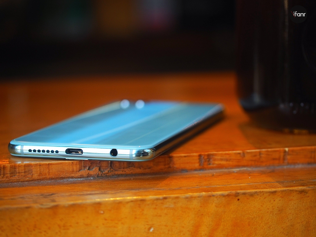 既然指纹识别被移到了前面,自然背部显得干净不少,官方称之为「无指纹设计」。整块玻璃只有双摄和闪光灯三个开孔,旁边有「Dual Lens」标签作为点缀。值得一提的是,后置双镜头会明显高于玻璃平面,换言之手机并不可以平放在桌面上。