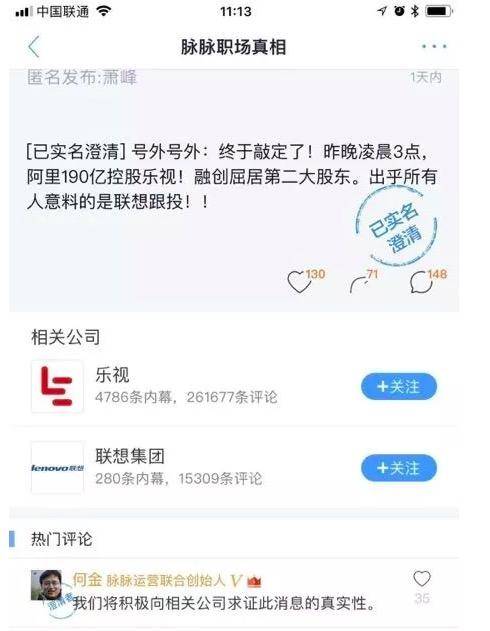 近日,有网友在脉脉匿名爆料称,阿里将190亿元控股新乐视。