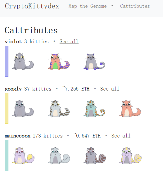 如果一只猫凑齐了几个稀缺的标签或者拥有一组非常罕见的基因组合,这只猫将被称为Fancy Cat,非常的罕见,也是游戏的目标。基因的组合和传递是不透明的,这吸引着玩家乐此不疲的买猫和生仔儿。