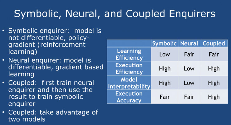 Symbolic Enquirer 在执行上很快,它的缺点是学习非常困难。Neural Enquirer 的优点是学习比较快,但执行上比较慢,相当于每次都要把数据库的表重新扫描一遍。自然的想法是将这两个 Enquirer Couple 起来,把两者的优点结合。学习的时候,先学 Neural Enquirer,学好了之后再让他去指导 Symbolic Enquirer,然后 Symbolic Enquirer 再去引导 Neural Enquirer,两个 Enquirer 互相帮助。