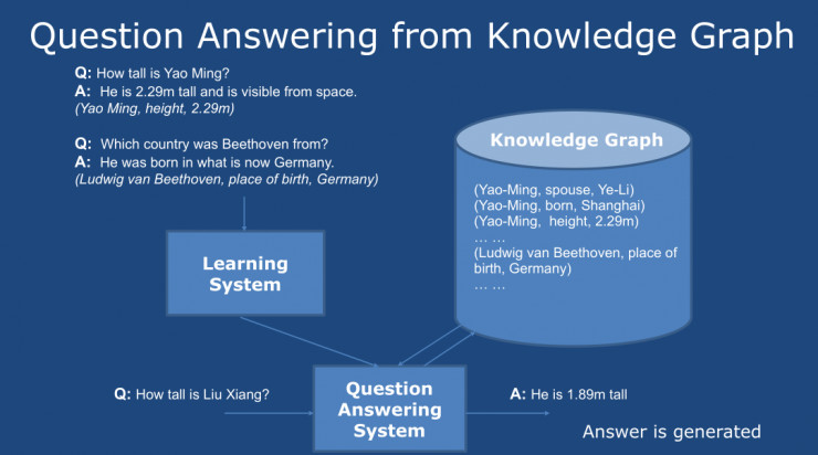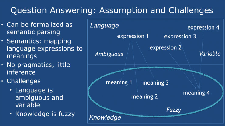 从这里可以看到自然语言并不好做,在自动问答系统中需要去做一个映射,映射里会面临前面提到的多义性、多样性、知识的模糊性这三大挑战。大家都在朝这样的智能问答系统努力。