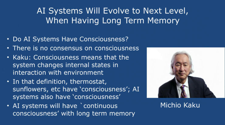 日裔科学家 Michio Kaku 对意识的定义如下:系统和外界交互,如果系统的内部状态发生变化,就认为这个系统是有意识的。从他的观点来看,温度计和花都是有意识的。对意识的讨论大家都有不同观点,很难达到共识。从他的定义来说,人工智能系统是有简单意识的,但没有长期记忆。