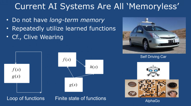 刚才看的是人脑,现在看人工智能系统,比如 AlphaGo、自动驾驶等,其实这些系统都是没有长期记忆的。这些系统里都有一定的模型,通过机器学习的方法事先学好,比如 AlphaGo 在下棋的过程中,调用训练好的模型。现在的人工智能系统,和我一开始提到的那个英国音乐家的案例很像,都属于 moment to moment,没有长期记忆。