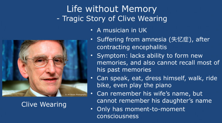 先来看看记忆对人的智能有多么重要。这里是一个示例,英国有一名叫 Clive Wearing 的音乐家,他现在七十多岁,他在四十多岁时患了脑炎,非常幸运的是他存活下来了,但不幸的是他大脑里的海马体受到了损伤,得病了之后不能再记新的东西。日常的症状如下,他认识自己的太太,但不认识自己的女儿,虽然说话、行动、唱歌、弹钢琴都没问题,但他没有记忆了,只有瞬间意识。大家有兴趣的可以去网上搜关于他的视频看一下。